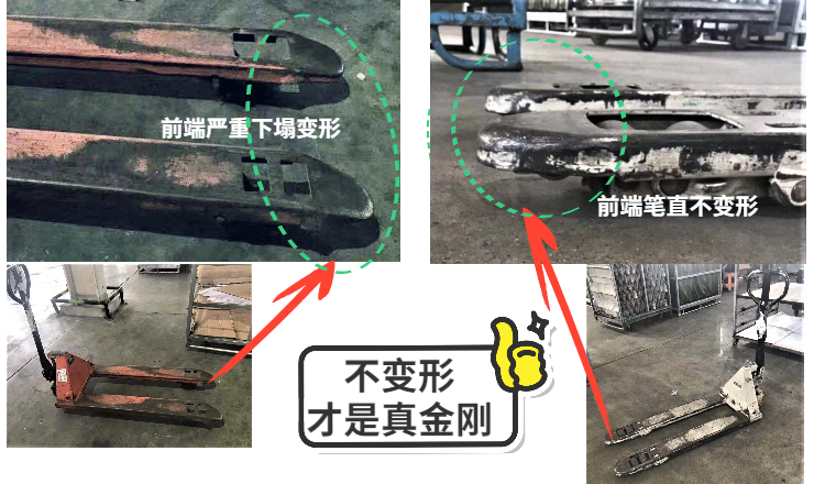 本款手動(dòng)叉車(chē)充分具備經(jīng)久耐用、貨叉前段不變形、操作輕松三大特點(diǎn)。