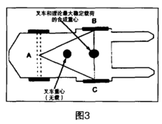 穩(wěn)定三角形和理論最大穩(wěn)定載荷幾乎所有的平衡重叉車都是一個三點懸架系統(tǒng),也就是說車輛是由三點支撐的。無論叉車是否有四個車輪,叉車轉(zhuǎn)向軸都是通過軸中心的一個支點八連接在車體上的。叉車驅(qū)動軸上兩車輪中心標記為B和C點,當把這三點用假想直線連起來,就形成一個三角形,三角形ABC被稱為“穩(wěn)定三角形”(如圖3)。