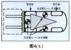 (c)動態(tài)穩(wěn)定性。以上的穩(wěn)定性討論沒有考慮車輛和貨物移動對叉車所產(chǎn)生的動態(tài)影響。重量轉(zhuǎn)移和合成重心變化取決于叉車運行、制動、轉(zhuǎn)彎、起升、傾斜和下落貨物等情況時產(chǎn)生的動態(tài)力,這些是影響穩(wěn)定性的重要因素。